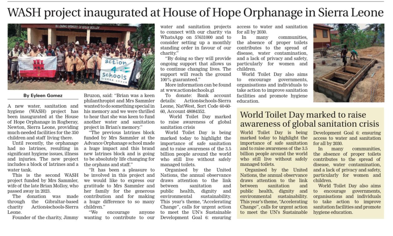 Gibraltar Chronicle article on latrines project at Rogbere Orphanage, Newton: